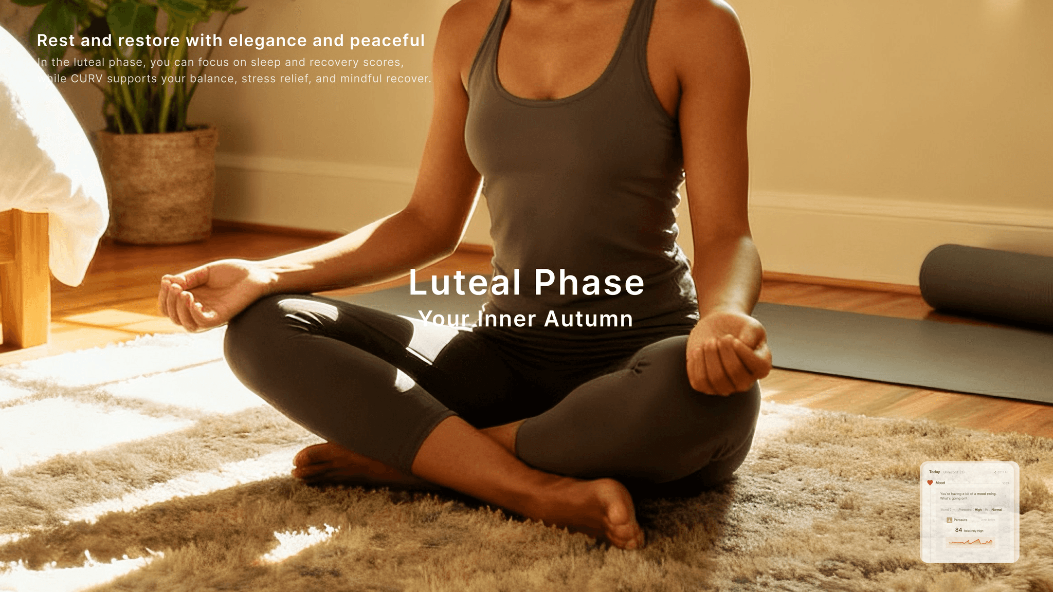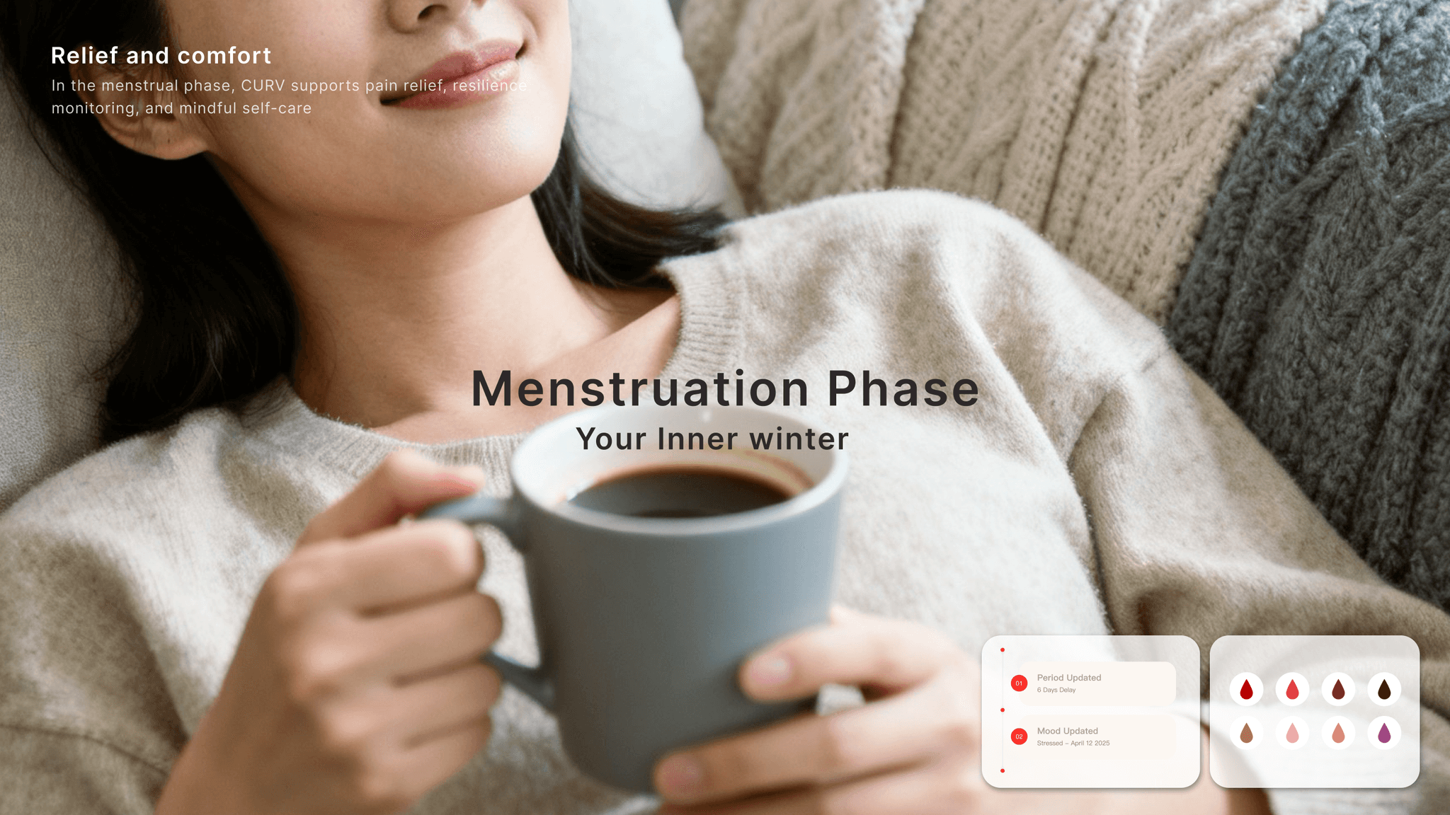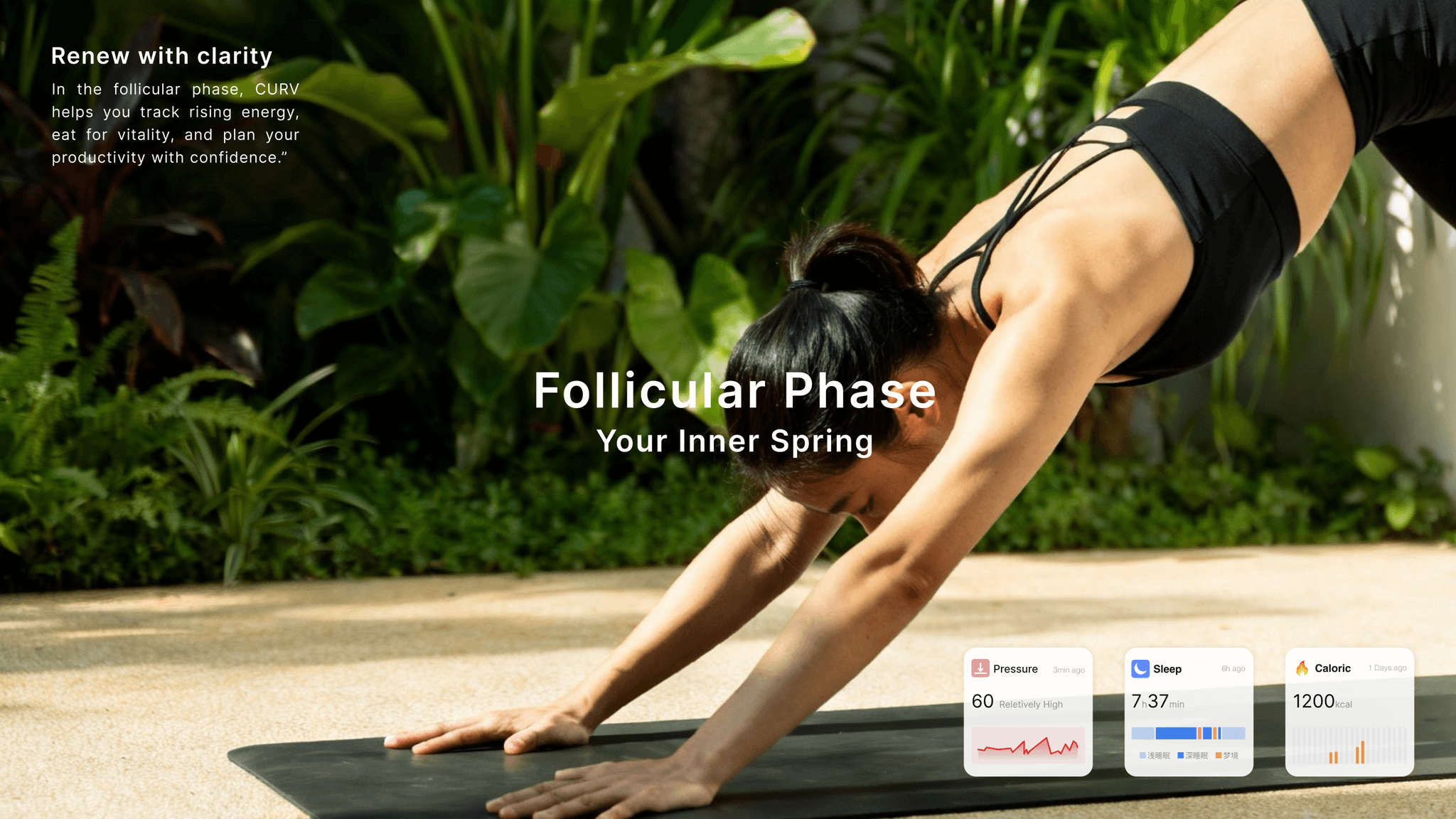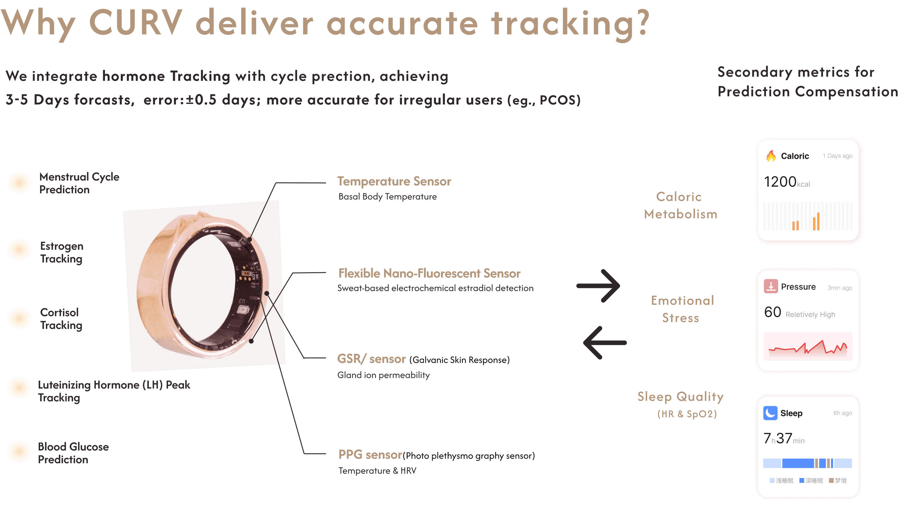 CURV provides cycle-based monitoring of key health indicators (heart rate, blood oxygen,blood glucose, blood pressure, sleep, stress, skin temperature, and bioelectrical impedance). These algorithms analyze how hormonal fluctuations across the cycle influence metabolism, energy, and mood.